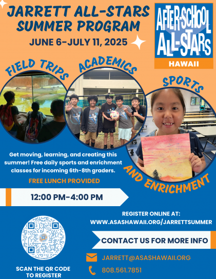 We are accepting registrations for the 2025-2026 school year. Please click on the button below to register. We look forward to welcoming your child to After-School All-Stars Hawaii.